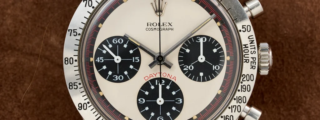 Rolex enviou um Daytona para Newman. Mas não foi qualquer Daytona. Foi um Ref. 6239 com dial exótico — um mostrador que apresentava sub-dials contrastados em tons de vermelho e preto, uma inscrição vermelha “Daytona” (extremamente rara), e proporções de índices que criavam estética completamente única. Este dial nunca foi oferecido em produção. Rolex o criou especialmente.